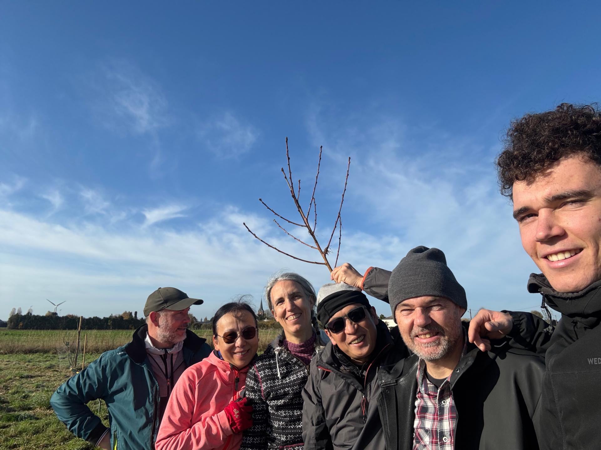 Grand beau temps pour cette troisième plantation avec l'aide joyeuse et efficace de Antoine, Wu, Jianhui, Gaétan, Olivier , Nicolas, Jean-Hervé, Jocelyne et moi même nous avons mis en terre 18 arbres : pêchers, brugnoniers, tilleul, châtaigner, figuier, néflier, prunier, cognassier, noisetier, naschi. Nous avons également complété les îlots de fruits rouges avec myrtillers, canneberge, arbre au faisons et poivre de Sichuan...ainsi que narcisses et crocus...pour le plaisir des yeux au sortir de l'hiver. Les tuteurs en châtaigner ont été achetés chez Bois Paysager du Neubourg, les arbres et végétaux ont été achetés au Marché aux arbres et aux végétaux du Neubourg et les végétaux à la Pépinière les bons plants